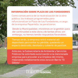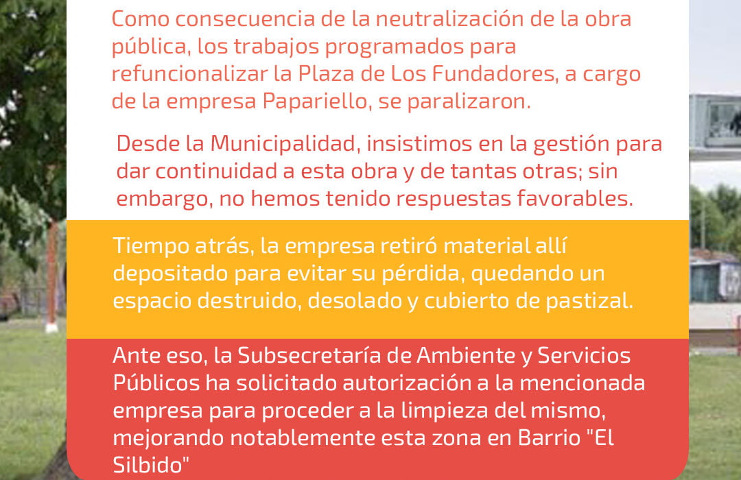 Como consecuencia de la neutralización la obra pública, los trabajos programados para refuncionalizar la Plaza de Los Fundadores, a cargo de la empresa Papariello, se paralizaron.